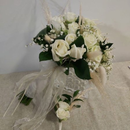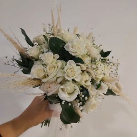 זר כלה המורכב מורדים וורדי-גינה, אלמנטים יבשים בצבע חול וגיבסנית